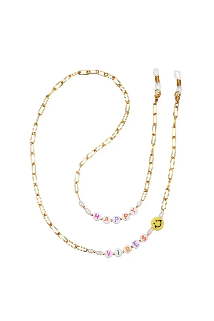 Kleurrijke bandjes voor je zonnebril met kralen met inscriptie happy. Hier wordt iedereen vrolijk van.