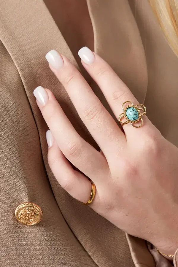 Shop nu deze prachtige gouden ring met classy bloem en grote blauwe of roze steen in het midden! De perfecte ring om enkel te dragen of juist te combineren met meerdere trendy ringen. De ring is gemaakt van stainless steel in combinatie met steen en is one size. Doordat deze ring one size is, kun je de ring perfect vormen naar elke vinger, ideaal.